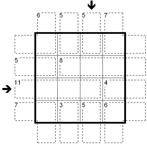 Die kleinen Zahlen geben die Summe der Ziffern in den markierten Gebieten an. Innerhalb dieser Gebiete dürfen Ziffern sich wiederholen.