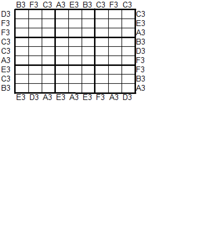 Enter the letters from 'A' to 'F' into the diagram, so that in every row, every column and every 3x3 block every letter occurs exactly once; in every row, every column and every 3x3 block three fields remain empty. The letters at the borders indicate at what place you encounter the letter in the corresponding row or column, e.g. B3 means that the B is the third letter you encounter in that row or column, empty cells not taken into account.