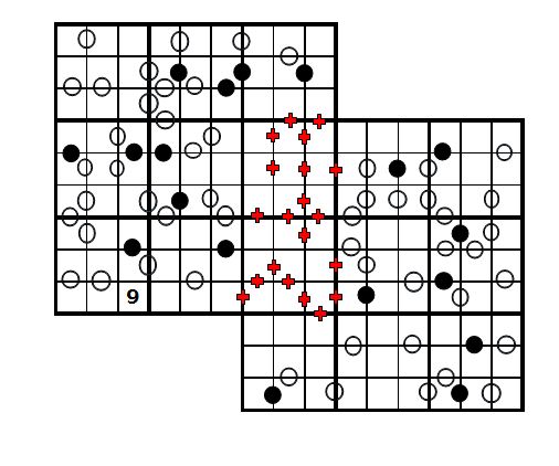 Kropki : Ein weißer Punkt bedeutet, dass die Ziffern die Differenz eins haben. Bei einem schwarzen Punkt ist eine Ziffer das Doppelte der anderen. Außerhalb der sich überlappenden Gebiete sind alle Kropkibedienungen angegeben.