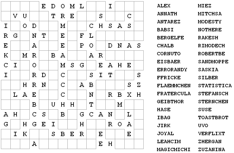 Finde alle Rätslernamen im Gitter. Sie sind jeweils horizontal, vertikal oder diagonal, vorwärts oder rückwärts geschrieben. Eine Buchstabenkette wurde aus dem Gitter entfernt. Diese Buchstaben müssen selbst eingefügt werden. Die unbenutzten Buchstaben bilden, hintereinander von links nach rechts und von oben nach unten gelesen, die Namen einiger weiterer Rätsler.