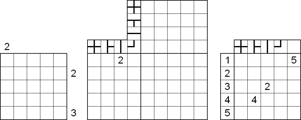 In die erste Abbildung sind Hochhäuser der Höhen 1 bis 5 einzutragen, so daß in jeder Zeile und jeder Spalte jede Höhe genau einmal vorkommt. Die Hinweise geben dabei an, wie viele Häuser aus der entsprechenden Richtung gesehen werden können, kleinere Häuser werden dabei von größeren verdeckt.