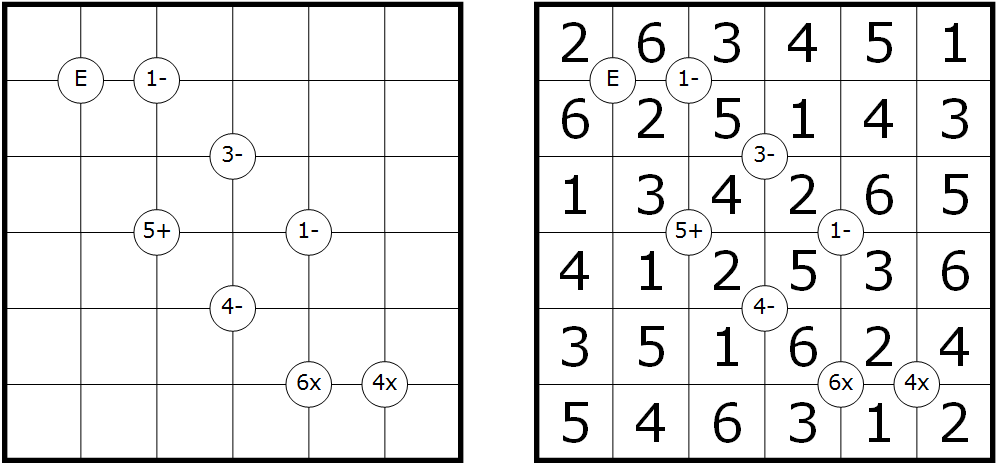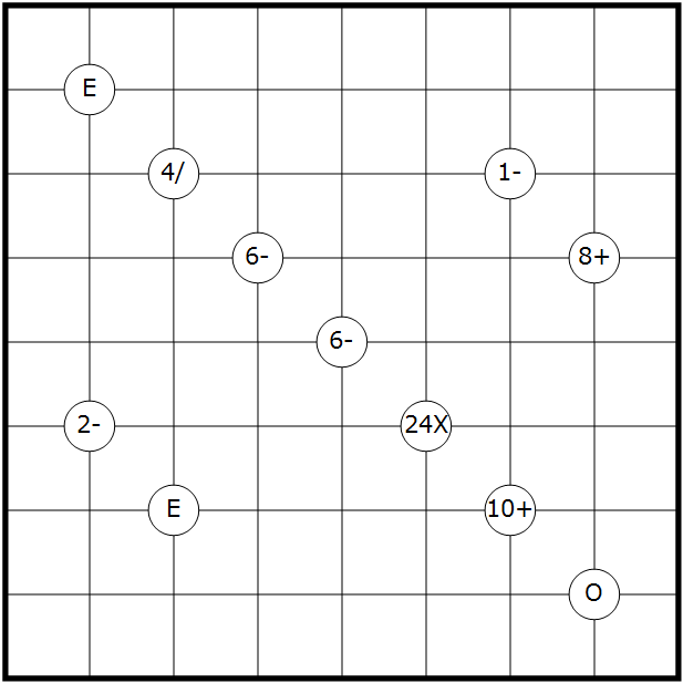 Place the digits from 1 to 8 in each row and each column. Some intersections of the grid lines are marked by a number and an operator (+, -, X, /) in a circle. The number is the result of the operation, applied to both pairs of diagonally opposite cells. An "E" in the circle indicates that all four adjacent digits are even; an "O" indicates that all four adjacent digits are odd.