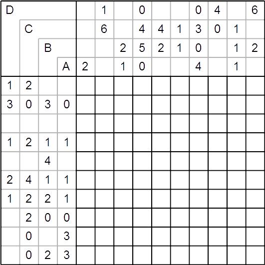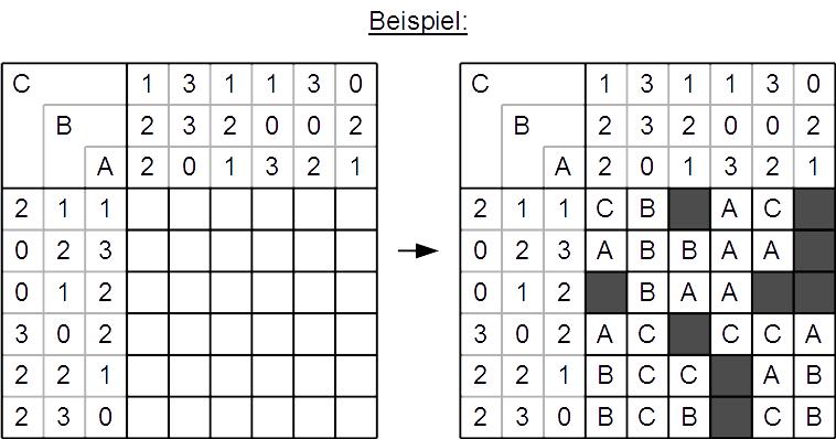 In einigen (meist allen) Zeilen bzw. Spalten befinden sich mindestens eine Reihe von Buchstaben, wobei mehrere Reihen von Schwarzfeldern abgetrennt werden. Jede Reihe enthält genau zwei verschiedene Buchstaben, die jeweils mindestens ein Mal vorkommen.