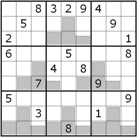 Place the digits from 1 to 9 in every row, column and 3x3-block. The digit on the top of the podium (1st place) is greater than the digit on the bottom left side (2nd place). The digit on the bottom left side of the podium is greater than the digit on the bottom right side (3rd place). The last digit in the podium-shape (7 in the example) doesn’t play any role.