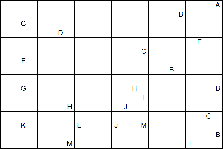 Platziere aus zwei Feldern bestehende Dominos auf leeren Feldern im Diagramm, sodass diese die verbleibenden Felder in Gebiete einteilen. Die Dominos dürfen sich dabei nicht orthogonal berühren und auch nicht überlappen. Gleiche Buchstaben müssen im gleichen Gebiet stehen und unterschiedliche Buchstaben in unterschiedlichen Gebieten. Gebiete ohne Buchstaben sind nicht erlaubt.