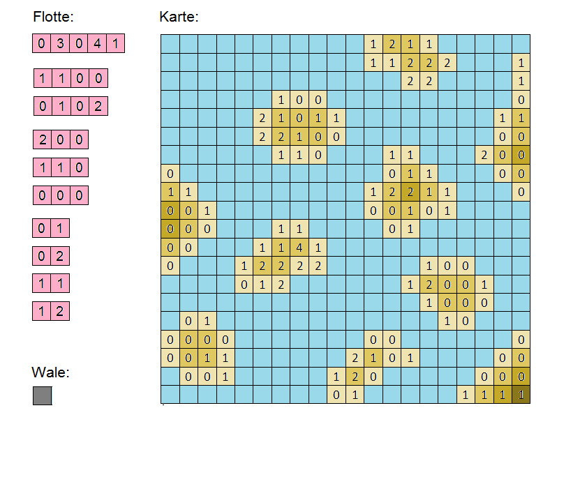 The number on the ship field indicates how many whales can be seen from this position. On whale could not be observated from the ships. You will have to find out yourself where it is located.