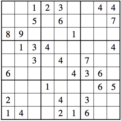 Put a number from 1 to 9 in each cell so that in each row, column, and 3x3 box no number occurs exactly once. I.e. if a number occurs at all, it must occur at least twice.