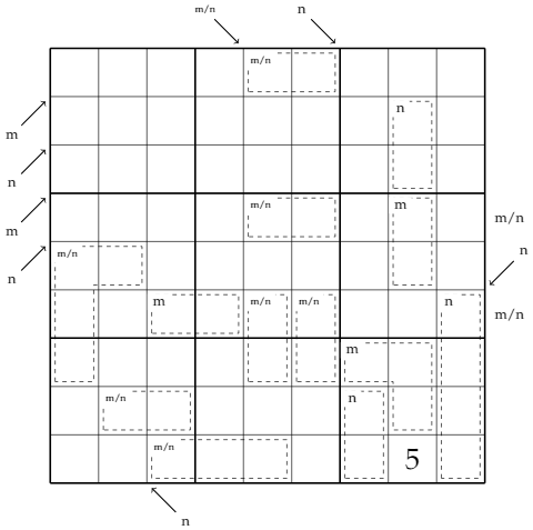 In this puzzle, m and n represent (not necessarily distinct) integers. In other words, every m clue sums to the same number and every n clue sums to a same (but possibly different from m) number. The m/n clue means that the sum is either m or n.