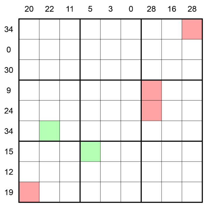 On the puzzle grid, Red Cells indicate all the fields where both a row and a column engaged in battle. Green Cells indicate all the fields where none of the four armies from that row or column ever entered.