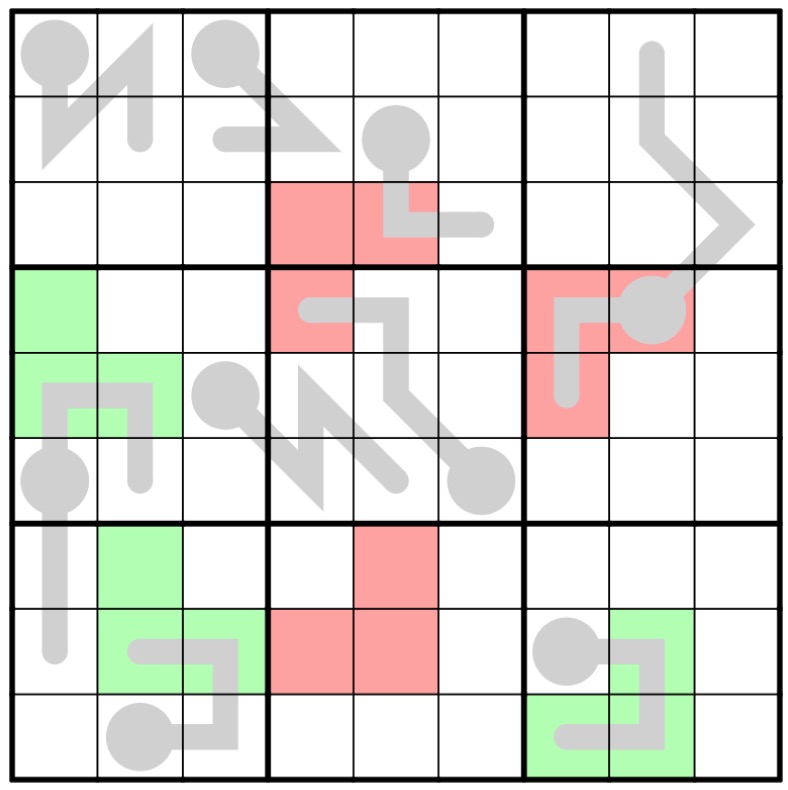 Normal Sudoku Rules apply. The Thermometers are burning! Their temperature rises up very fast! That means that there are no consecutive numbers on the thermometers (numbers rise up by minumum 2 digits from the bulb end). Each coloured region always has the same digits (different colours may NOT have repeated digits!) Also, the coloured regions are anti-clones: They are never identical, even when rotated or mirrored.