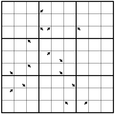 Standard sudoku rules apply. Cells with arrows in them are the sum of the next 3 cells in that direction. If fewer than 3 cells are available in that direction, then all available cells are summed.