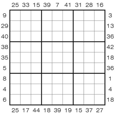 The numbers outside the grid indicate the sum of the first one or several digits in that direction.