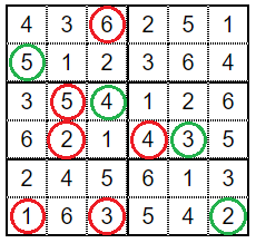 The solution to this example is shown below. As can be seen, the 1 in the red circle makes knight's moves with increasing consecutive digits to reach the 6 in the red circle. Same for the 2 and 5 in the green circles.