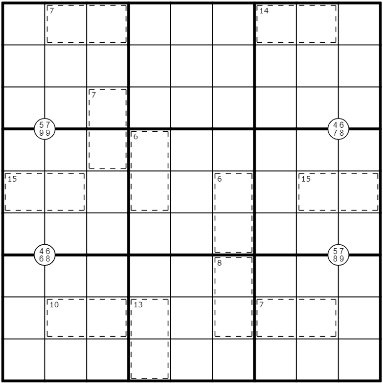 The small circles with numbers in them are forming quadruples. The four cells around a circle must contain the same numbers in some order.