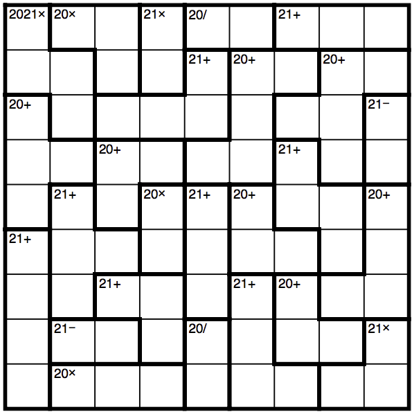 Each cage indicated by the thick lines shows an arithmetic operation (+, -, x, or /) and the result of that operation applied to the numbers in the cage.