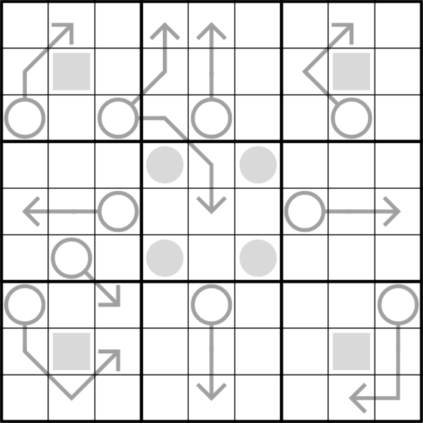 • Arrows: Digits along an arrow in the grid must sum to the digit in its circle. Digits may repeat along an arrow.