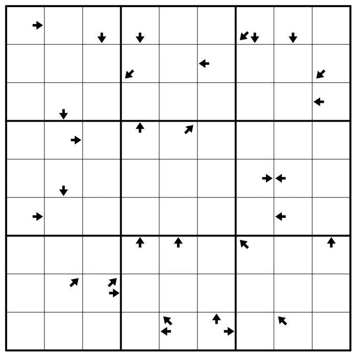 An Arrow in a cell indicates that the cell's value is N, and the Nth cell in the direction of the arrow will have a digit that is consecutive to N. For example, a cell with a 4 and an arrow means that the fourth cell in the direction of the arrow will be either 3 or 5. All possible arrows are indicated.