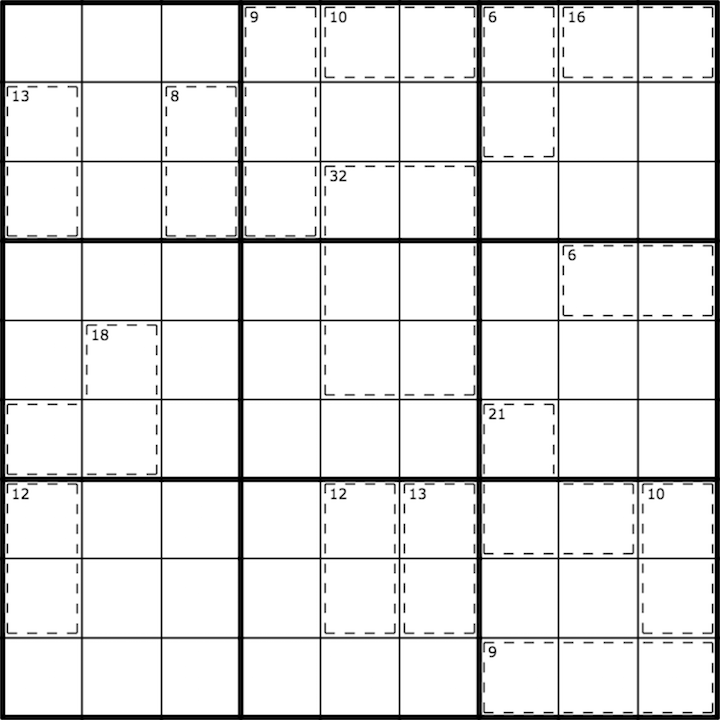 Normal killer sudoku rules apply. Digits must sum up to the number in the top left corner. Numbers may not repeat in a given cage.