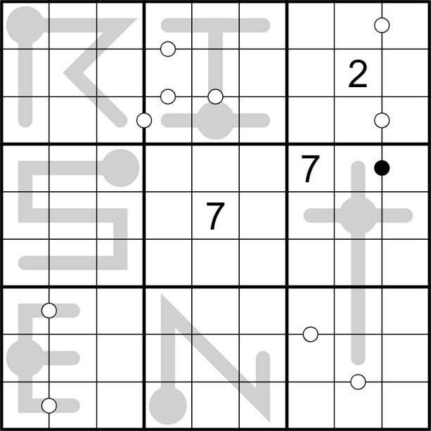 White dot indicates that the adjoining cells contain consecutive numbers (there is no negative constraint, that is, the lack of a white dot does not imply the cells are nonconsecutive).