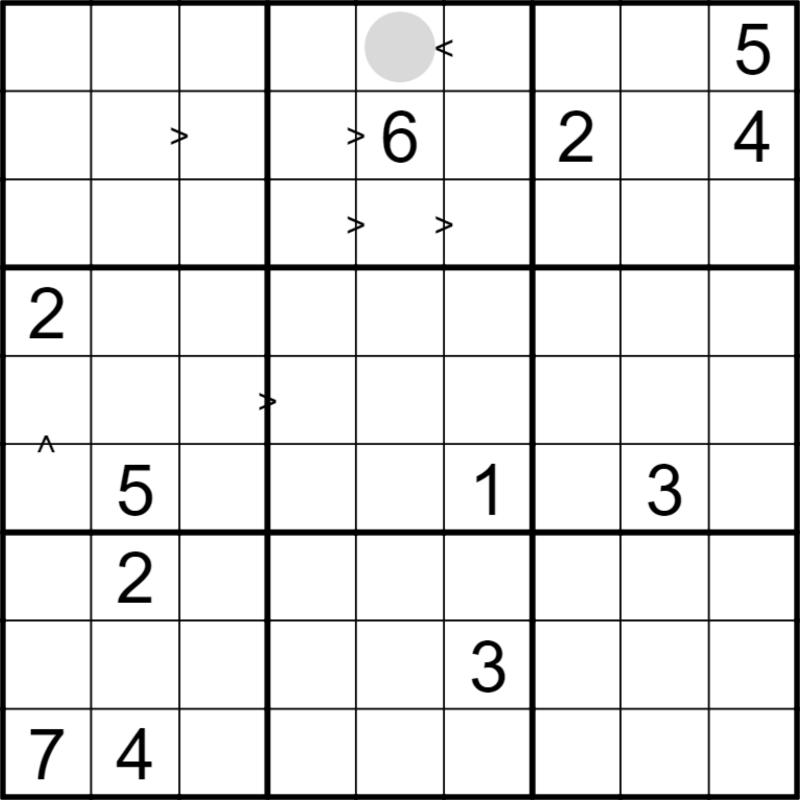 In every 3x3 box, the odd digits form a pentomino shape. The cell with a circle is odd. Inequality signs tell which of the two cells is larger.