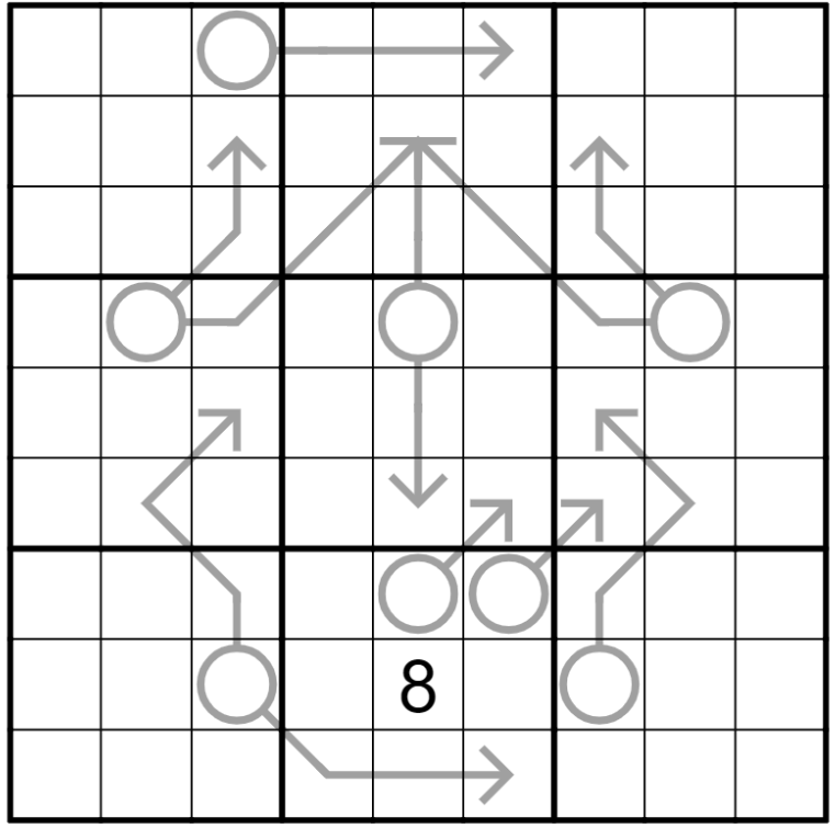 Arrow Sudoku rules apply. Digits along the arrows in the grid must sum to the digit in its circle.