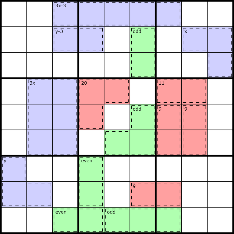 The expression in the top-left corner of each cage describes the sum of all the digits within it, giving either the value or the parity thereof. The values of constants x and y are to be determined - they may not necessarily be distinct integers!