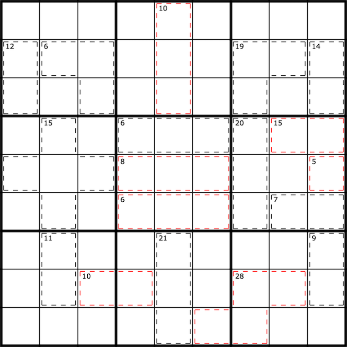 - Red cages are psycho killer cages. Digits placed in cages point to boxes in the grid, and provide a referred digit which is the digit in the same position in the box that is pointed to. The referred digits in the cage must sum to the small clue in the top left corner of the cage. Referred digits may repeat.