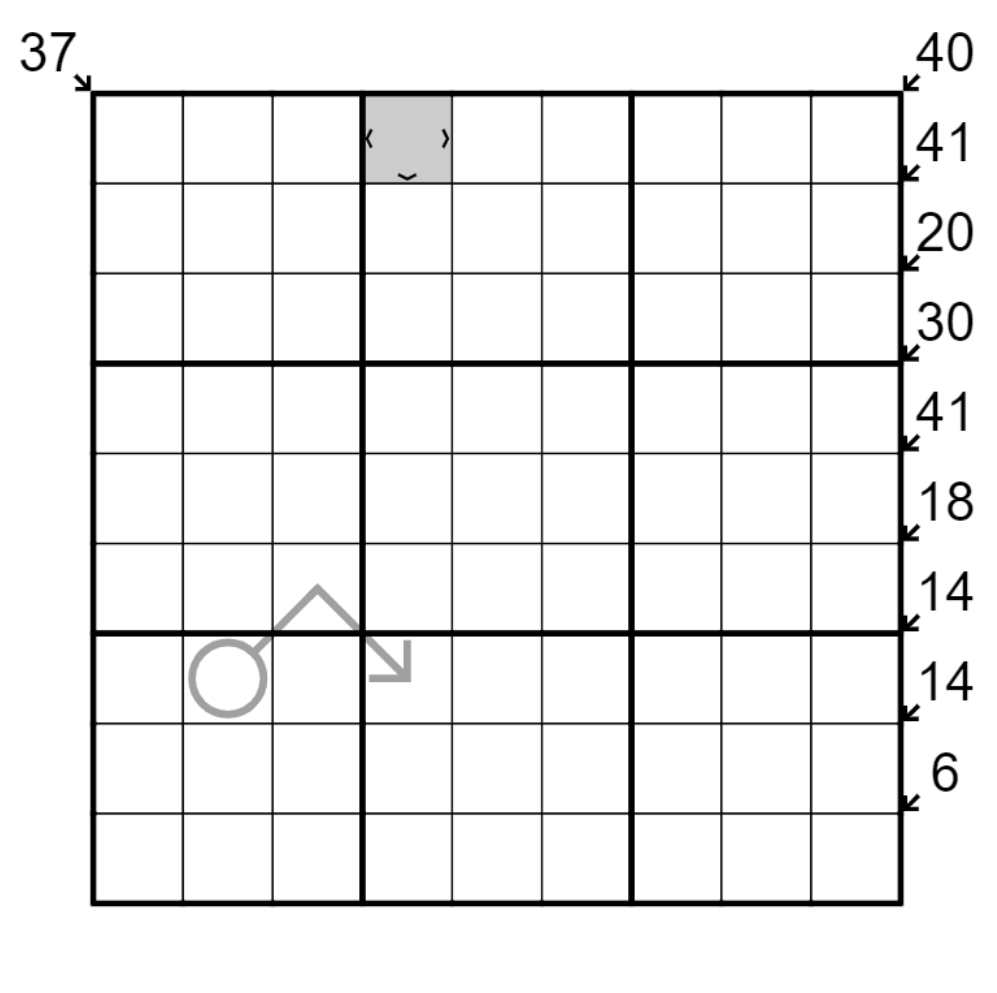 Rules: Normal sudoku rules apply. Numbers outside the grid give the sum of the digits along the indicated diagonal. Digits along diagonals may repeat if allowed by other rules. The digit in row 1 column 4 is larger than its 3 orthogonal neighbors. Digits along arrows must sum to the digit in the arrow's circle.