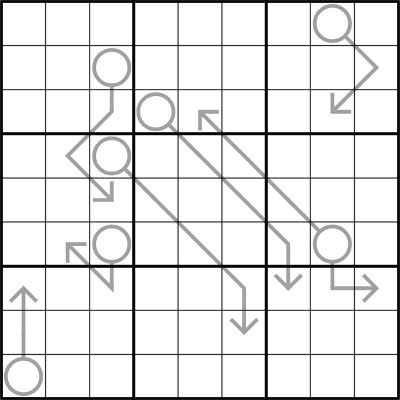 Arrows: Digits along the arrows in the grid must sum to the digit in its circle