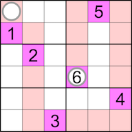 6x6 grid showing a "scattered" region. Notice how all the purple cells form a kind of 10th digit with only one purple cell in each row, column and box (but no anti-king rule apply). Also notice that the numbers increase strictly from 1 to 6 as the cells progress along the snake from the beginning to the end.