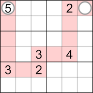 The snake starts in the circle in box 1 and ends in the central circle in box 5. The snake can not touch itself even diagonally, and does not branch.