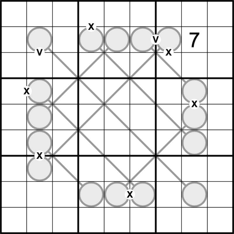 A V between cells means that these digits sum to 5, an X that they sum to 10. Not all Xs and Vs are given.