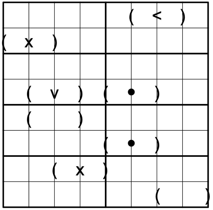 In this fun sudoku variation - the 'given digits' have been hidden. The solver must determine their locations. Note, don't skip the example puzzle! It's a very fun little puzzle that will likely teach you some logic that will be helpful in the 8x8. Also, if someone wants to create a full 9x9 - please do! My summer vacation has run out and so I won't have time to get to it. I'd love to see what someone else could make with this idea!