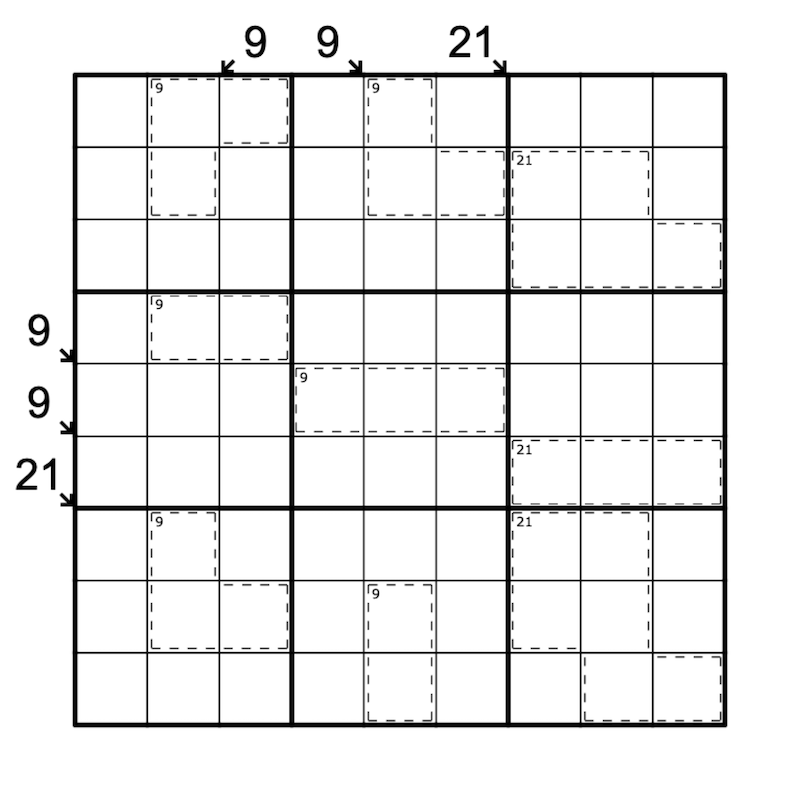 Little Killer: Digits along indicated diagonals must sum to the given total. These digits may repeat if allowed by the other rules.