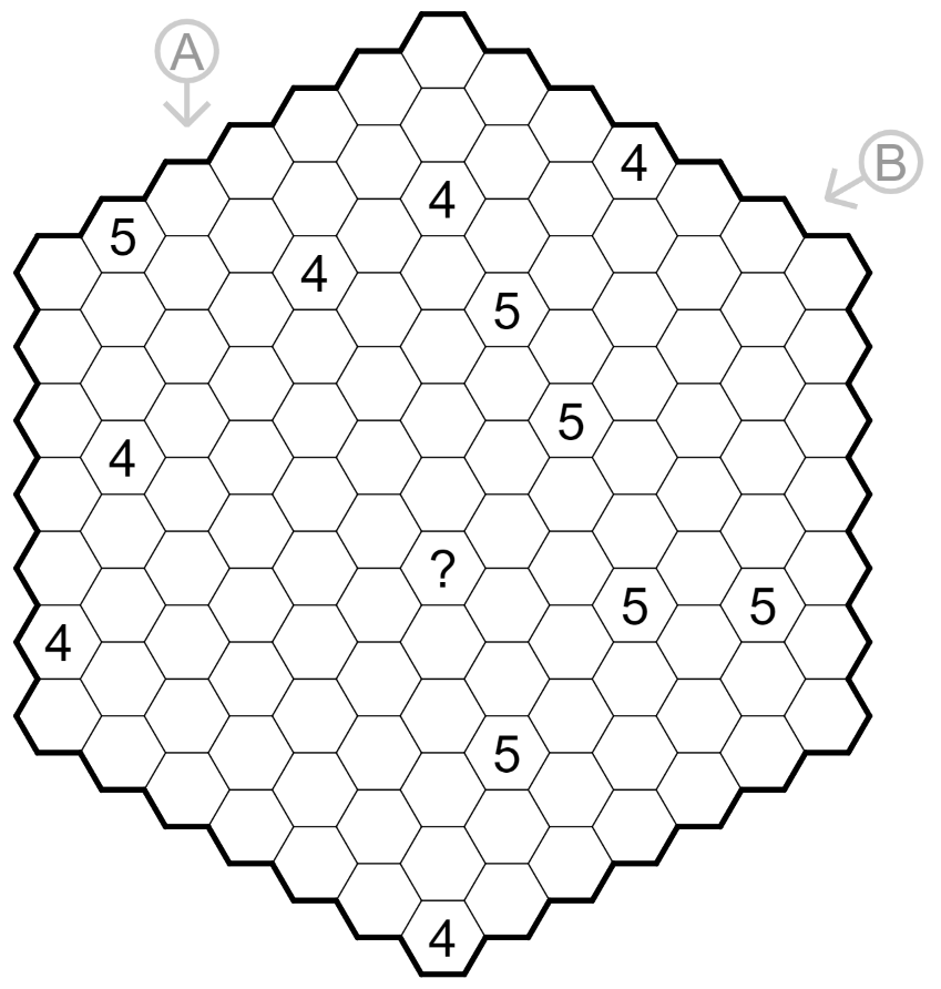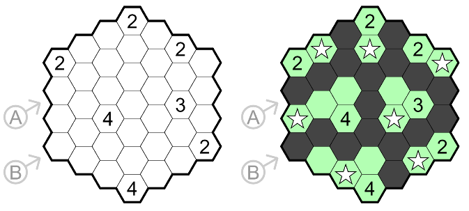 Solution code: Along lines A and B: for each continuous set of shaded cells, put the length of the set. For a star, put *.