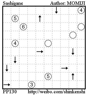 Sashigane's puzzle was originally published in the 134th issue of "Puzzle Communication Nikoli" (March 2011), and it was published as a "half-fixed" puzzle in the 138th issue (March 2012). However, it was not upgraded to a "fixed fan" puzzle in the end, and the 149th issue issued in December 2014 became the last issue of nikoli to publish this puzzle.