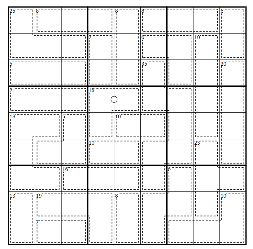 HOWEVER, 18 cells - two in each box, row and column -are "island" cells - these do not count toward the cage totals. Only "ocean" cells count towards cage totals. There can be as many island cells as needed in any cage.