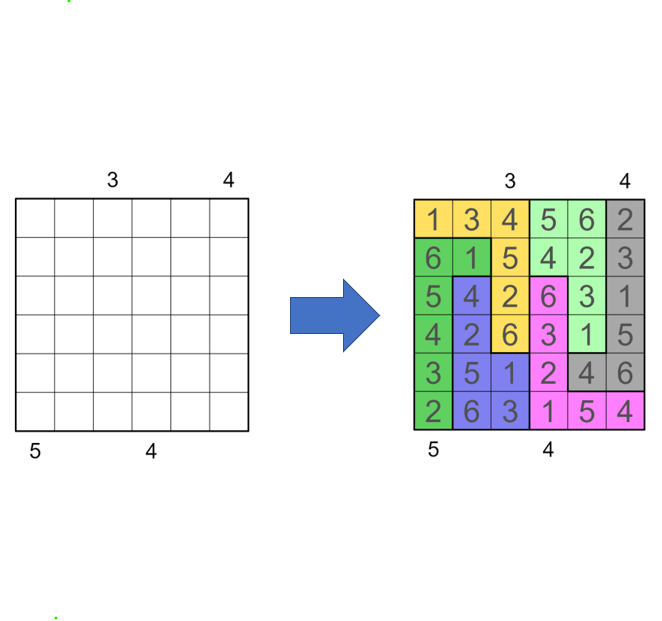 -) Clues outside the grid are "chaos skyscrapers". They give the amount of buildings seen in their row/column, from their perspective. Additionally, all cells up until and including the highest building (9) from their perspective are in the same region, and if there is a cell directly behind that building (9) it must be in a different region. (all of the above is what makes up a "chaos skyscraper") The "?" can be any number.