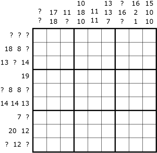 Shade some cells such that clues outside the grid indicate the sums of digits in contiguous sets of unshaded cells in the corresponding row or column, where each question mark represents a number (1-45). The individual sets of unshaded cells have to be separated by at least one shaded cell.