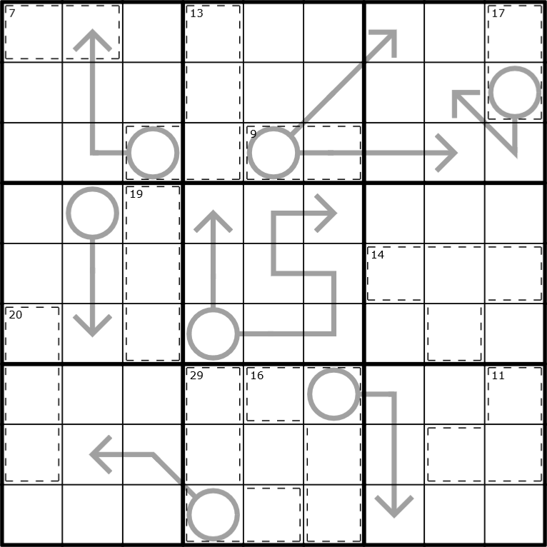 Digits in cells along an arrow sum to the same total as the digit(s) in the connected circle.
