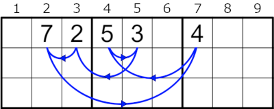 A pair of colored boxes in a row or column indicates that there is an N-Chain that stays between the boxes and includes both boxes. The length of the N-Chain is given in the top left corners of the boxes. Blue boxes show N-Chains in rows, and red boxes show N-Chains in columns.