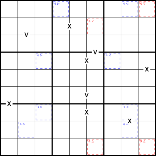 Cells marked by a V must sum to 5. Cells marked by an X must sum to 10. Not all Xs and Vs are given.