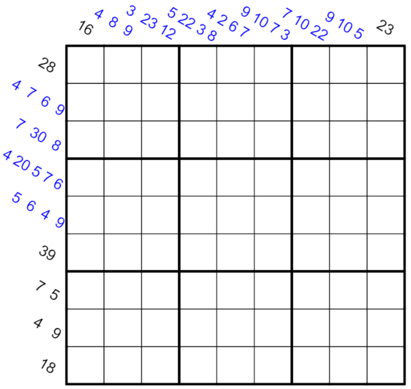 Normal two-color Japanese Sums rules apply. The colors used in this puzzle are black and red.