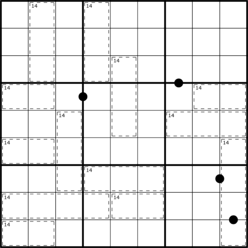 Every horizontal or vertical line of connected digits which sums to 14 is marked with a cage.