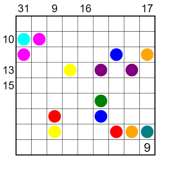 An irregular sandwich sudoku, but with a twist: regions are hidden, and must be determined by the solver by connecting circles of the same colour. This rule set is inspired by Flow Free.