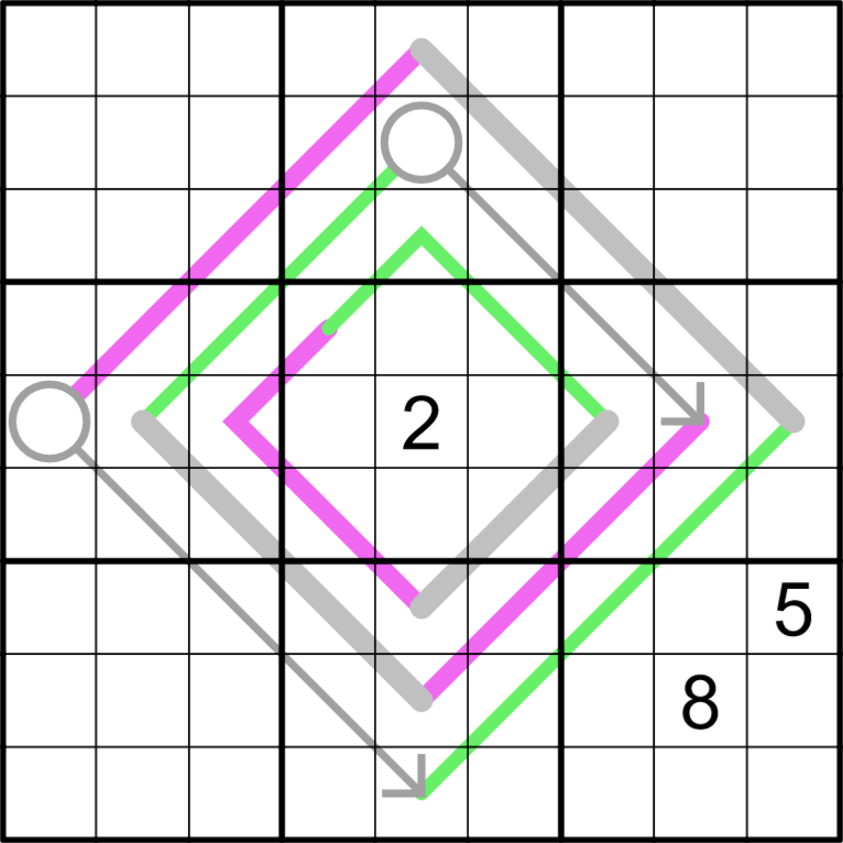 Normal sudoku rules apply. Digits along an arrow sum to the digit in that arrow's circle. Grey lines are palindromes. Adjacent digits along the green lines have a difference of at least five. Cells connected by purple renban lines form a set of consecutive, nonrepeating digits in any order.
