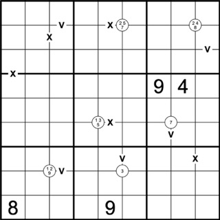 standard XV-Rules apply: Cells connected by an X sum to 10, cells connected by a V sum to 5. No negative constraints apply.