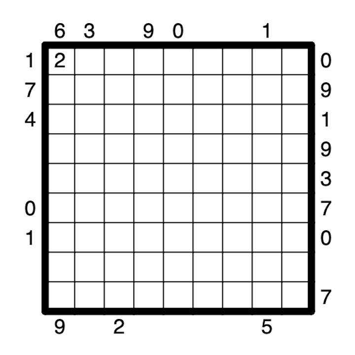 2. Treat each number N as a building of height N. A clue outside the grid indicates the number of buildings seen from from that direction, where taller buildings hide shorter buildings. Each seen building is in a different region.
