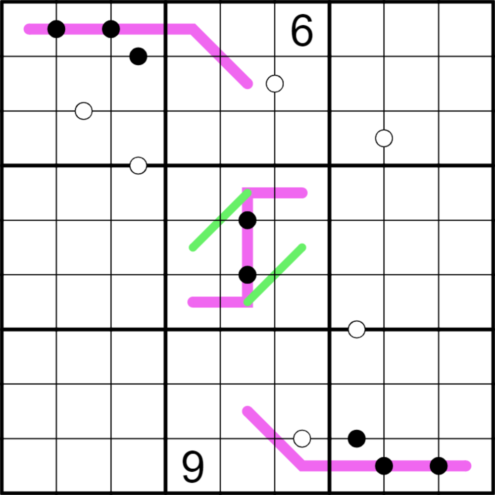 - Kropki: A black dot between cells indicates cell values with a 2:1 ratio. A white dot between cells indicates cells with consecutive values. ALL BLACK DOTS ARE GIVEN!