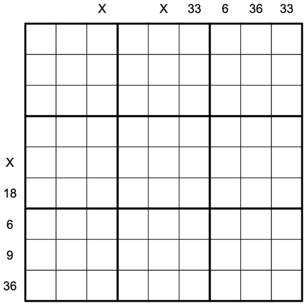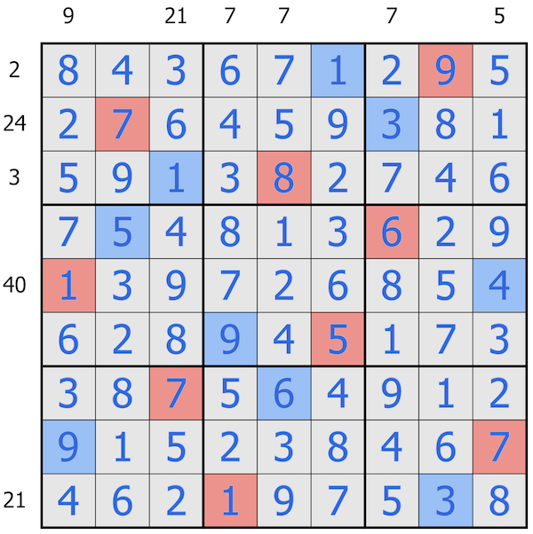 - [Red/Blue Sandwich]Shade the x'th cell in each row red, where x is the digit in column 1 of that row. Shade the y'th cell in each column blue, where y is the digit in row 1 of that row. Numbers on the outside of the grid indicate the sum of the digits sandwiched between a red and blue shaded cell in that row or column.